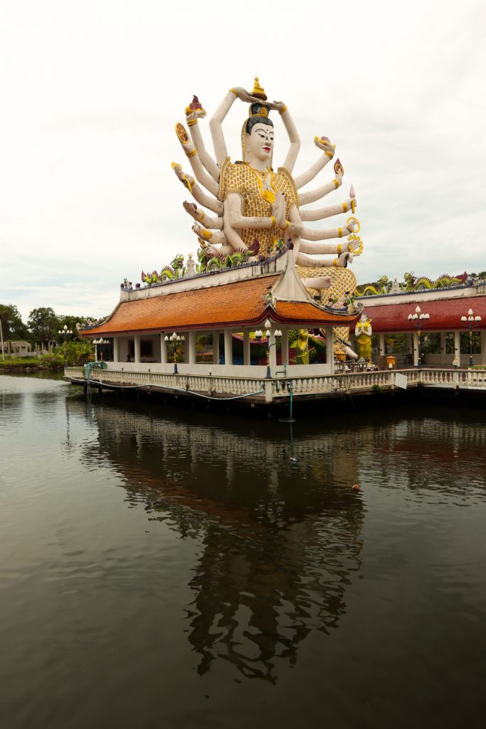 Der Wat Plai Laem ganz im Norden von Koh Samui ist ein moderner, buddhistischer Tempel dessen Besuch kostenfrei ist. Es ist eine niedliche Tempelanlage die aus ihren Mix aus chinesischen und thailändischen Elementen hervorsticht. Überall gibt es was zu entdecken. Die vielen, kunstvollen Details haben uns sehr gefallen. Da wir kurz nach einem Regenschauer dort waren, gab es einige Pfützen auf dem gefliesten Boden (Achtung! Sehr rutschig!) und dementsprechend tolle Reflexionen. Da geht mein Hobbyfotografenherz auf.