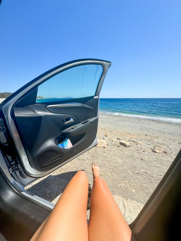 Da der Strand im Süden der Insel liegt, muss man durch das bergige Inland der Insel fahren und durchquert eine atemberaubende Schlucht auf dem Weg – die Fahrt lohnt sich!